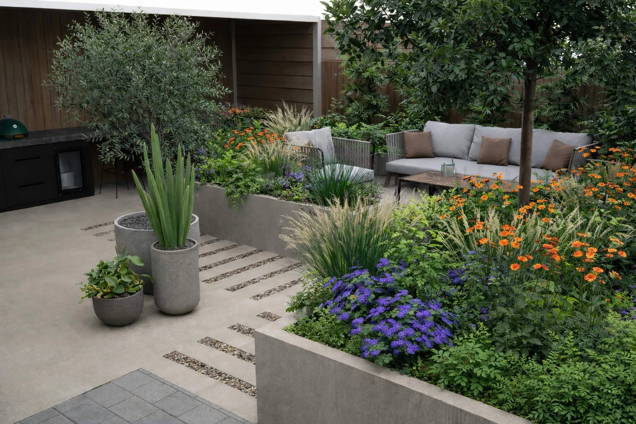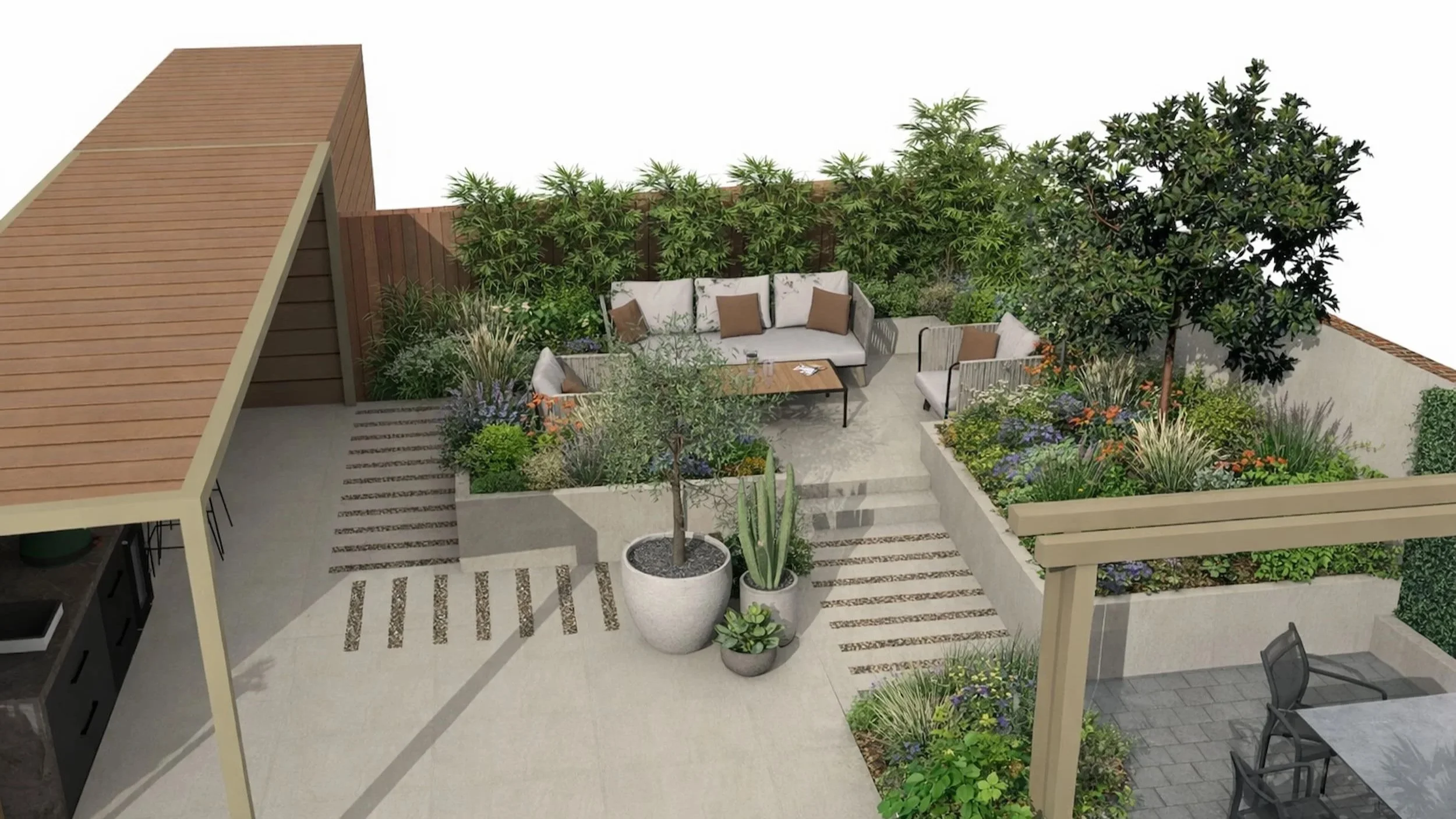 A series of connected terraces and pathways guide movement through the garden, establishing distinct areas for dining, relaxing and entertaining. Architectural elements, including feature planters and clean-lined paving, provide rhythm and cohesion, while subtle changes in level add depth and visual interest.